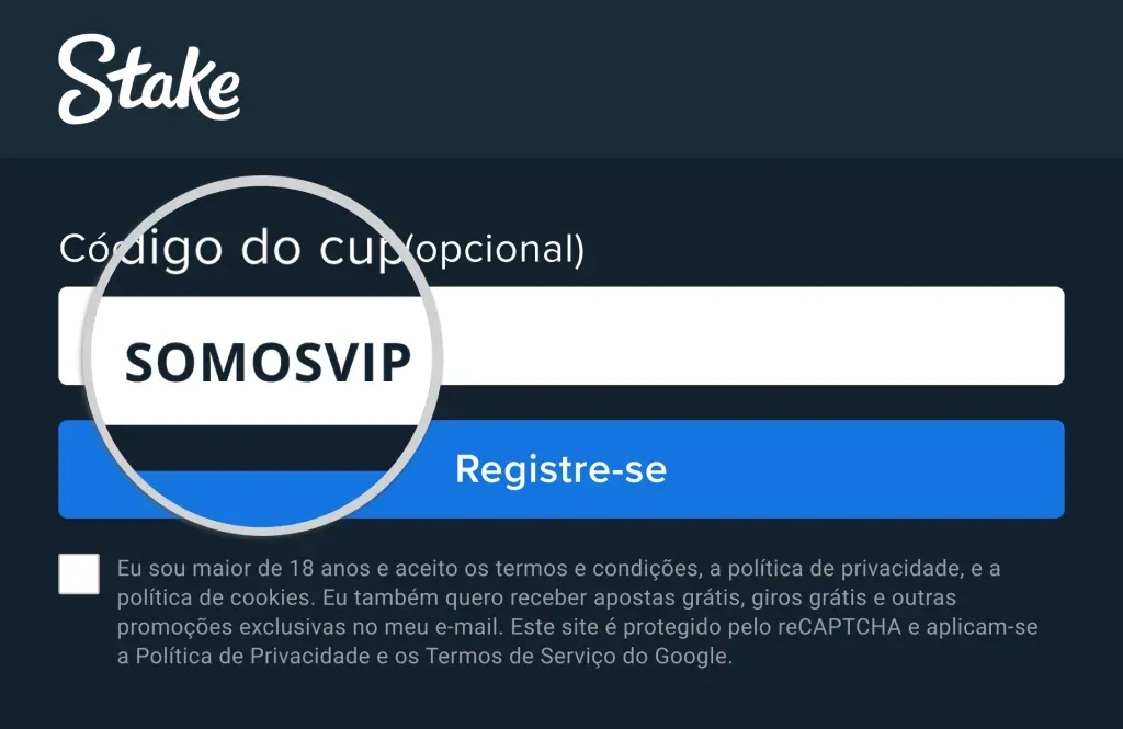 O código Stake é o SOMOSVIP. Você pode usar este código promocional no momento do cadastro na plataforma, garantindo acesso às principais ofertas e bônus da casa.