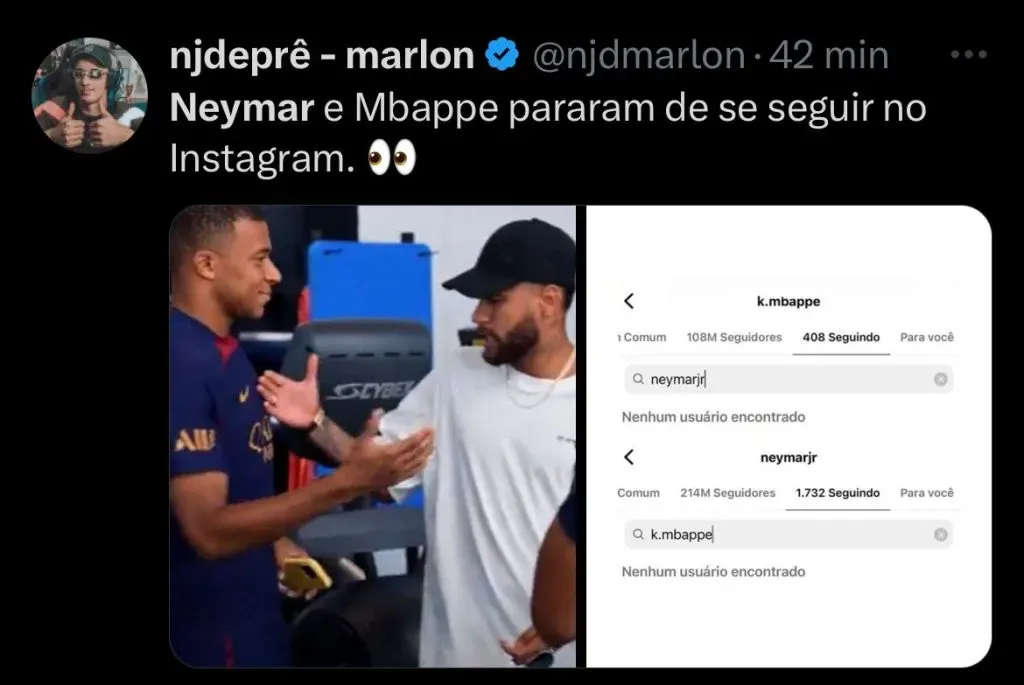 Torcedores e fãs de Neymar repararam nos últimos dias que o jogador brasileiro deixou de seguir o atacante francês Kylian Mbappé em uma de suas redes sociais.