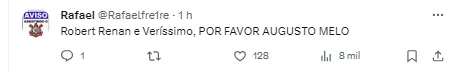 “Robert Renan e Veríssimo, POR FAVOR AUGUSTO MELO” , “VOLTA PELO AMOR DE DEUS CORINTHIANS EH DA EUROPA” , “Mas porque está sendo pouco aproveitado no grandioso Zenit? Volta pelo amor de Deus” , “Aceitamos devolução sem custos” , “Volte pra casa” . “Venha imediatamente” , “Ia ser fo* tentar ele, ele com o Veríssimo na zaga ia ser put*