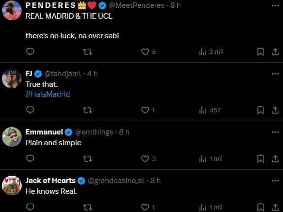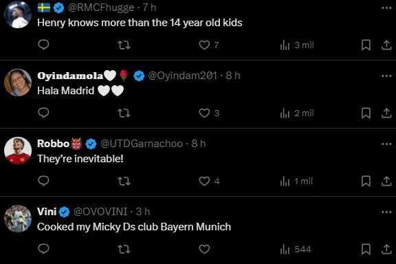 Via CBS Sports, o francês Thierry Henry se rendeu ao feito do Madrid e acredita que isso é mais do que ter sorte. Ele acredita ser diferente a atmosfera que envolve o gigante da Espanha.