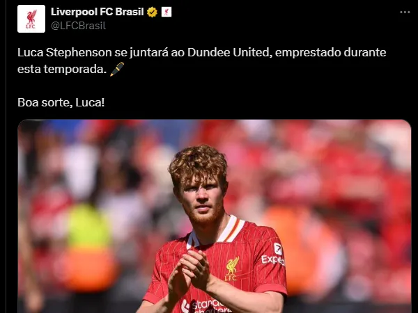 O perfil do Liverpool no Brasil traz o anúncio oficial que Luca Stephenson não será aproveitado por Slot e está sendo emprestado para o Dundee United nesta temporada.