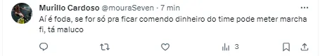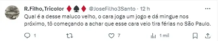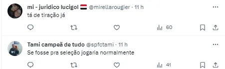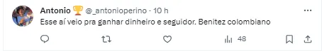 “Não está jogando nada mesmo” , “Inacreditável” , “Se fosse pra seleção jogaria” , “Na seleção é leão, joga meio tempo aqui contra o Cuiabá e sai quebrado. Que p** é essa” , “Esse aí veio pra ganhar dinheiro e seguidor. Benitez colombiano” ,”Migué da p. Tá feio essa m já. Na seleção não tem lesão, falta de ritmo, simplesmente é 10 e faixa!”.