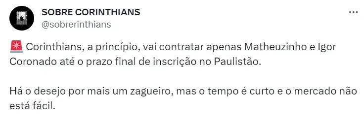 Perto de anunciar seu novo reforço, o Corinthians segue de olho no mercado em busca de mais. Hoje, segundo a imprensa local, a prioridade da Diretoria é a chegada de um zagueiro.