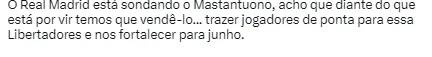 Nas últimas semanas, o Real Madrid teria enviado representantes para a América do Sul com dois objetivos, segundo o jornal. O primeiro era acompanhar Endrick e o segundo era ver de perto a evolução de Mastantuono no primeiro ano como profissional do River Plate.