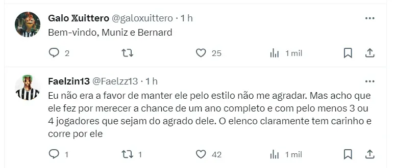 Um dos nomes que são possíveis alvos do Galo para 2024 é Bernard, ídolo do clube e que, atualmente, atua no futebol europeu, na Grécia. Não há informações sobre conversas neste momento, mas há o interesse do Galo.