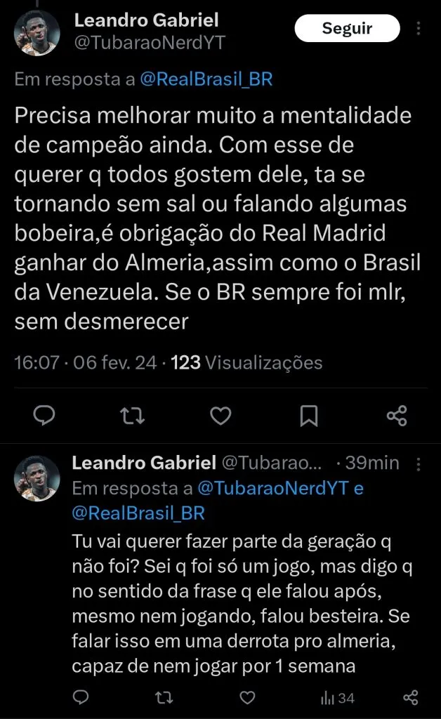 “Precisa melhorar muito a mentalidade de campeão ainda. Com essa de querer que todos gostem dele, está se tornando sem sal ou falando algumas bobeiras. É obrigação do Real Madrid ganhar do Almería, assim como o Brasil da Venezuela”, dispara um internauta.