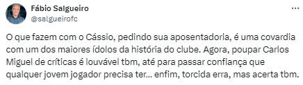 “Quem plantou isso fui eu, porque eu acabei jogando em um nível tão alto aqui no Corinthians que as pessoas acham que eu vou sempre jogar num nível eu não vou errar, que não vou falhar, que qualquer bola é defensável, que a bola impossível pra mim é possível”, disse Cássio em entrevista à ESPN.
