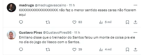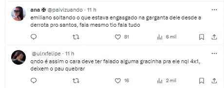 Além disso, Emiliano não deixou barato e disse mais sobre o técnico do Santos, Marcelo Fernandes.