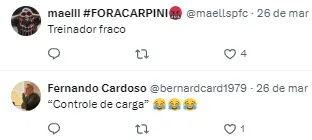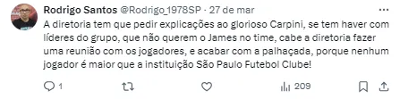 Agora, a cobrança da torcida em relação ao atleta tem sido em cima das decisões do treinador. Contra o Novorizontino, por exemplo, torcedores exigiram a entrada do jogador e chamaram Carpini de burro pela demora em colocar o colombiano em campo.