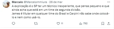 Mas e no São Paulo? A situação tem sido diferente. Ele chegou com status de titular, mas teve uma temporada tumultuada e chegou a pedir para deixar o clube por falta de chances. Para o técnico Thiago Carpini, ele ainda não tinha condições físicas de atuar.