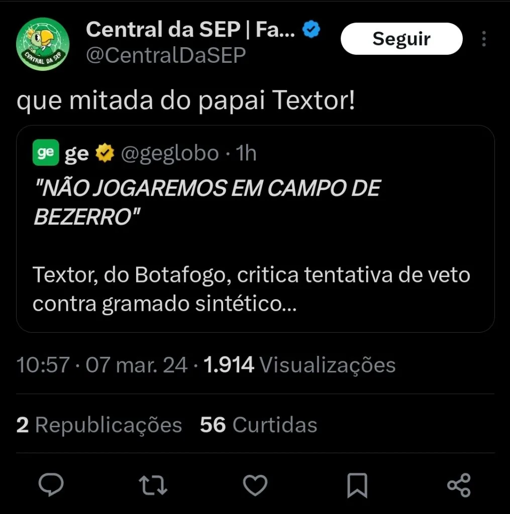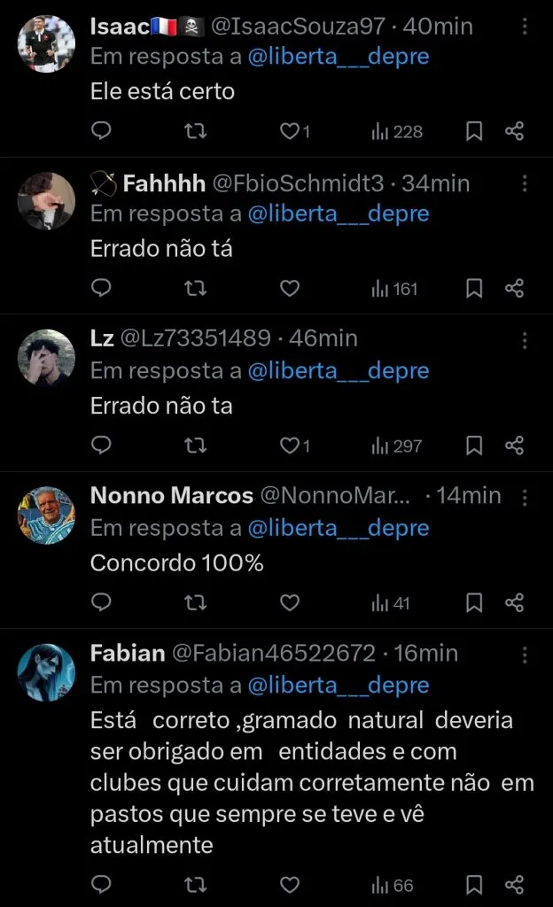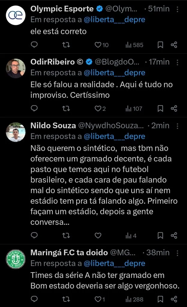 “A grama no Brasil é diferente. Olhe para todas lesões de tornozelo e nas pernas que tivemos em gramados ruins. Se vamos jogar em campos de bezerros na liga, as pessoas devem investir em campos 80% naturais e 20% sintéticos, que é o padrão das grandes ligas no mundo”, completou John Textor.