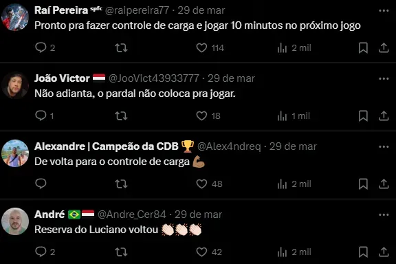 “O James é um grande jogador, todo mundo vê isso. Cada um aqui tem a sua oportunidade, sei esperar o meu momento. Estou brigando pelo meu espaço, às vezes não estou tão bem, entendo isso”, declarou Luciano.