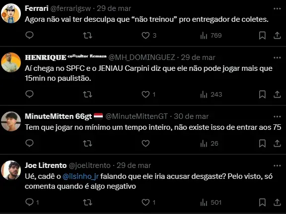 “Não sei como as pessoas falam que ele não consegue jogar aqui (no São Paulo) porque toda a vez que ele entra, joga, joga bem, assim como na Seleção (Colombiana)”, finalizou.