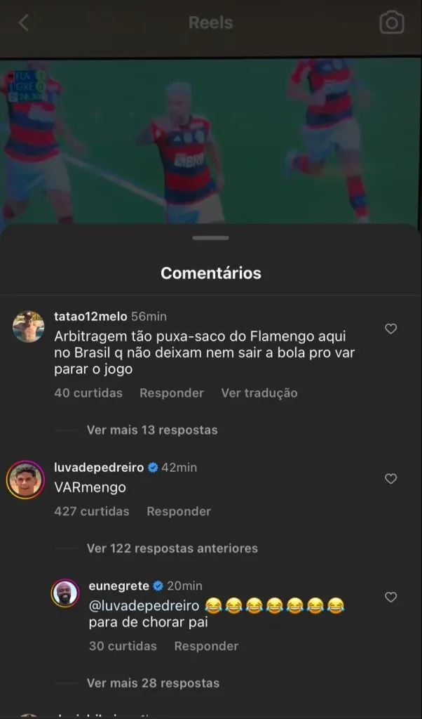 Luva de Pedreiro recorreu às redes sociais para fazer uma provocação ao Flamengo após a classificação na Copa do Brasil. O influenciador publicou em sua conta no Instagram o seguinte comentário: “Varmengo”, em alusão ao pênalti marcado para o clube carioca durante a partida.