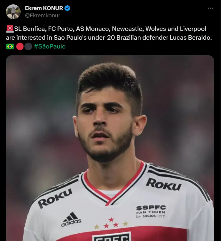 De acordo com as informações publicadas pelo jornalista Ekrem Konur, o Liverpool tem interesse na contratação do zagueiro Lucas Beraldo, de apenas 19 anos de idade.
