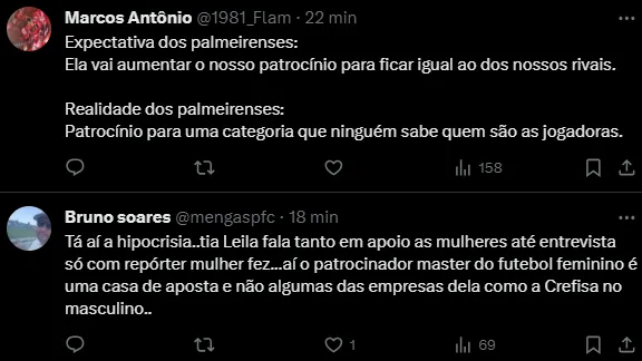 Leila disse em outra oportunidade que não deixaria o Palmeiras sem o posto de maior patrocínio do Brasil, porém viu os rivais Corinthians e Flamengo passarem o atual campeão brasileiro.