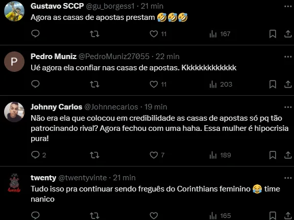 Ela, inclusive, põe em dúvida o acordo fechado pelo novo mandatário do Timão, Augusto Melo, dizendo que tudo pode ser verdade enquanto o contrato não é apresentado como prova. Palmeiras é o principal rival do Alvinegro.