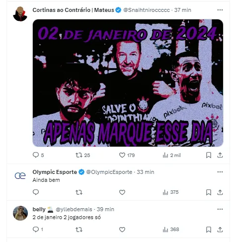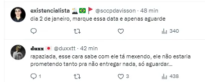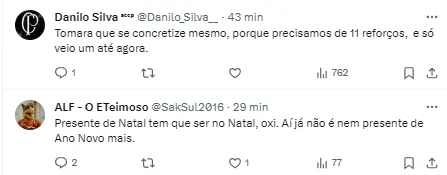 “Presente de Natal tem que ser no Natal, aí já não é nem presente de Ano Novo mais” , “Por que não acredito?” , “Difícil de acreditar nesse mentiroso”, “Rapaziada, esse cara sabe com o que está mexendo, ele não estaria prometendo tanto para não entregar nada. É aguardar” , “Festival de promessas” , “Tomara que se concretize mesmo, precisamos de 11 reforços e só veio um até agora” , publicaram alguns torcedores.