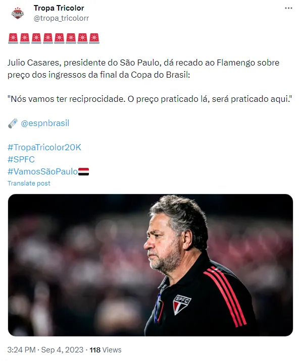 Como o São Paulo terá a vantagem de decidir em casa, os preços dos ingressos para as partidas estão sendo discutidos. O presidente do São Paulo, Julio Casares, abordou esse assunto em uma entrevista à ESPN Brasil e também enviou uma mensagem ao Flamengo.