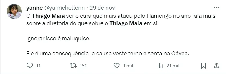 Thiago Maia não vem apresentando bom desempenho em 2023 e tem sido alvo de fortes críticas por parte da torcida do Mengão. As críticas torcida crescem diante da queda significativa de rendimento do atleta em comparação com a temporada passada.