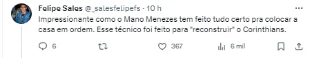 “O Corinthians vai fazer uma reformulação (…) Não se trata dessa ou aquela posição. Envolve muita coisa, questão financeira, interesse de jogador, capacidade de investimento. Não estamos nesse estágio (de contratar). Não conversamos ainda sobre esse assunto pois entendemos que não é a hora”, explicou.