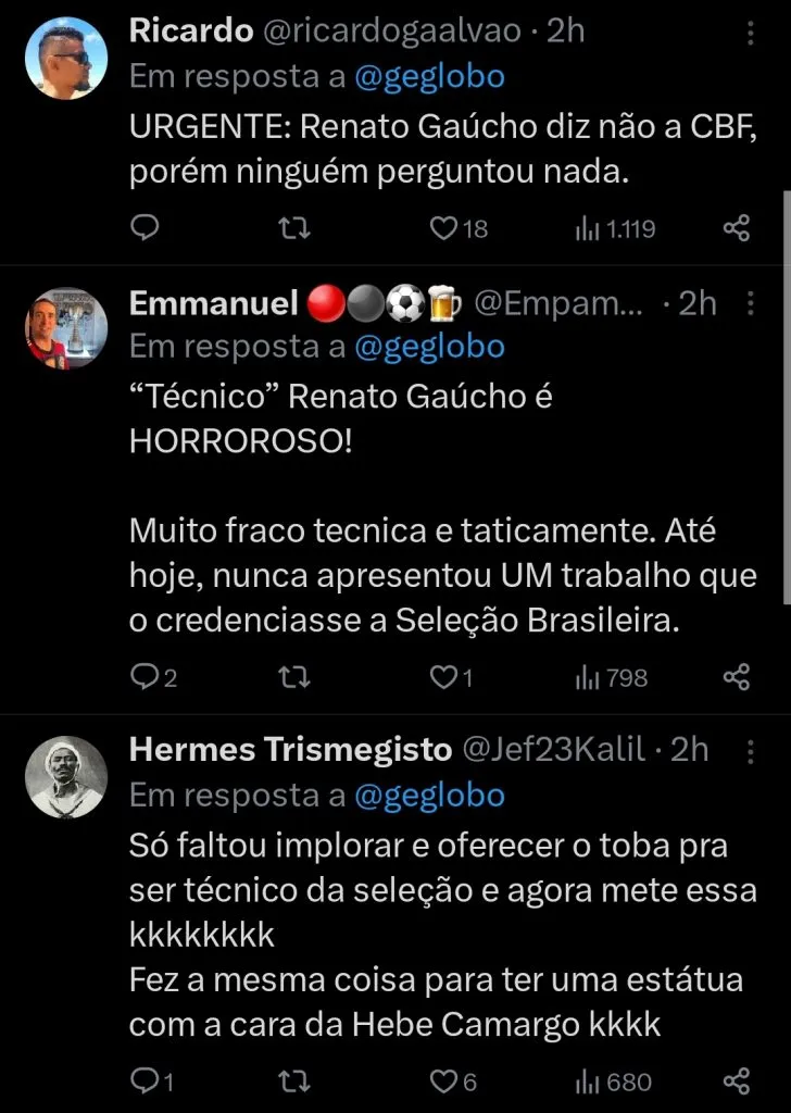 “Do jeito que está a situação da CBF, independente de quem seja o presidente, mas ele tem que tomar vergonha na cara. Para o bem do futebol”, finalizou Renato Portaluppi conforme repercussão nas redes sociais.