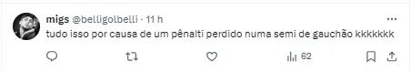 No sétimo pênalti a ser cobrado, o jogador tentou uma cavadinha, mas o goleiro Gabriel defendeu com facilidade. Na cobrança seguinte, o adversário converteu e eliminou o Inter em pleno Beira-Rio.