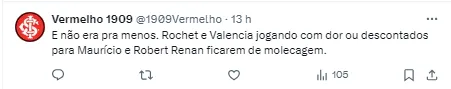 Uma fonte do vestiário do Internacional ainda disse que “não tem mais clima para Robert Renan seguir no Internacional”.