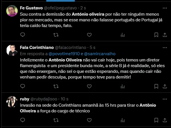 Após a derrota do Corinthians para o Palmeiras pelo placar de 2 a 0, com lance bizarro envolvendo Raphael Veiga, o técnico António Oliveira mandou um recado à gestão do Alvinegro.