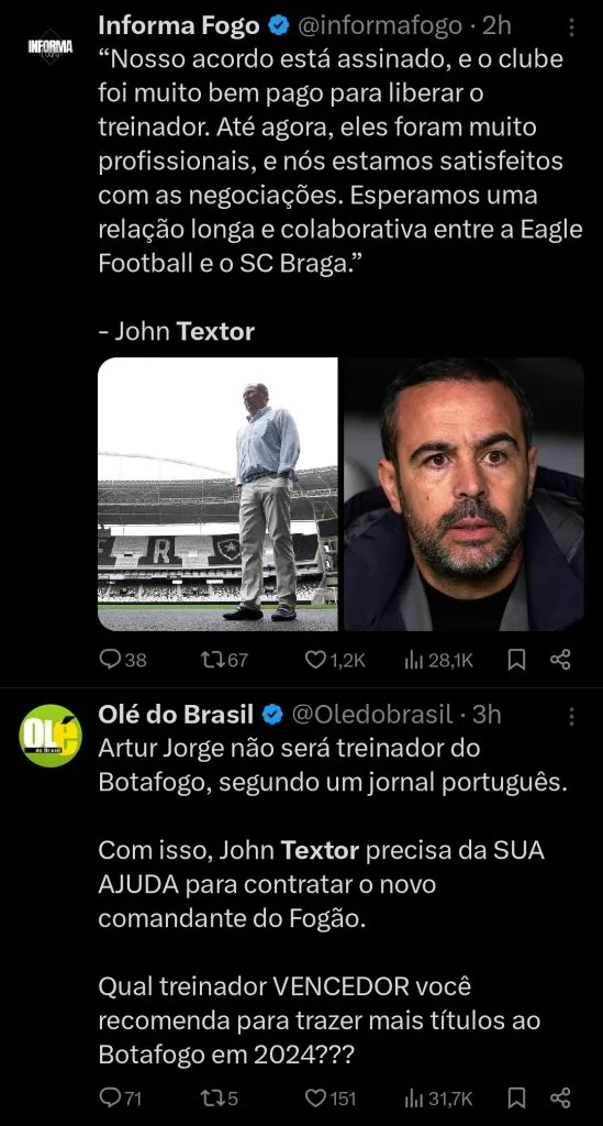 O Botafogo está em busca de treinador e as informações no Brasil dão conta do acerto com Artur Jorge. Porém, em Portugal as atualizações dão conta que o negócio travou de última hora.