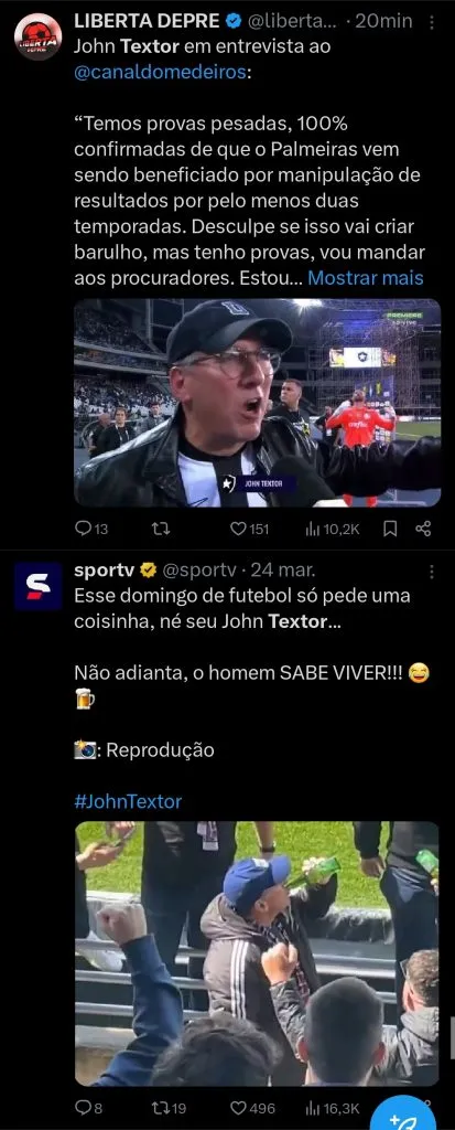 “Temos evidências pesadas, 100% confirmadas que Palmeiras vem sendo beneficiado por pelo menos duas temporadas. Desculpe se isso vai criar barulho, mas tenho evidências”, disse.