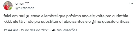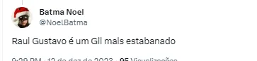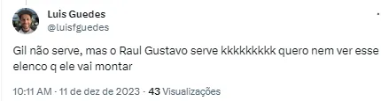Outros não concordam: “Raul Gustavo é um Gil mais estabanado” , “Gil não serve, mas o Raul Gustavo serve kk. Quero nem ver esse elenco q ele vai montar , “Jogador pra série B, empresta ou vende, não faz falta nenhuma aqui”, “5 pênaltis garantidos pros adversários no ano”, “O Bahia quase cai porque tinha uma zaga horrível, e ele ainda era reserva de lá. Sem mais” , “A gente se livra de um horrível e já vem outro”.