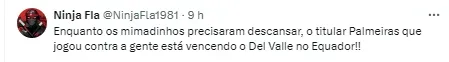 Muitos fizeram a comparação que a equipe do Palmeiras optou em levar seus jogadores importantes para o duelo contra o Independiente del Valle e conquistou a vitória pela Libertadores. Confira a manifestação dos torcedores abaixo (SIC).