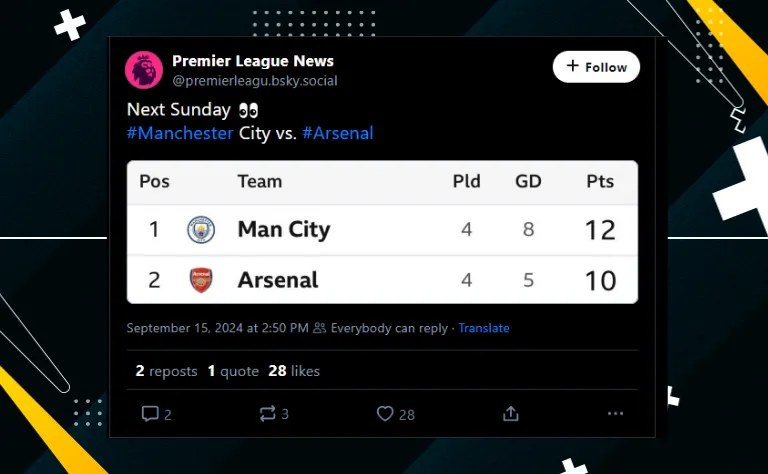 O Arsenal tem 10 pontos na tabela de classificação daPremier League, enquanto o Manchester City soma 12. Com ambos invictos, os grupos sabe que quem avançar assume a liderança.