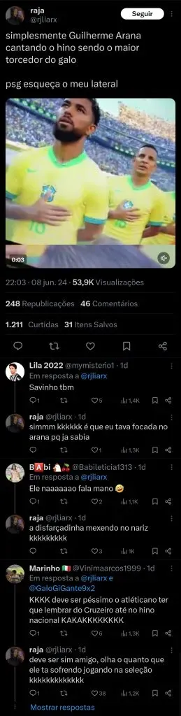 A Massa Atleticana torce para que o Paris Saint-Germain não leve Guilherme Arana embora ao Parque dos Príncipes. Ele está em evidência com a Amarelinha e pode ficar ainda mais a depender do desempenho na Copa América.