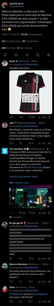 “Mais um detalhe: o valor que o São Paulo pede para a nova casa de apostas é 50 milhões de reais anuais + o valor da multa com a Sportsbetio. Informação EXCLUSIVA que vocês viram primeiro aqui”, finalizou o setorista Gabriel Sá.