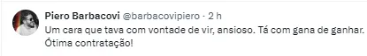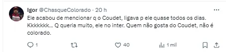 “Fundamental a ligação do Coudet. Mandava áudio de dois, três minutos. Dizia que resolveria. Eu avisava à família. Não comia e dormia, mas estava vivo, feliz. Nunca aconteceu do cara ligar todos os dias. Ele disse que estavam aumentando a proposta e daria certo. Agradecer ao esforço dele, da direção, e do Renê, que contou os bastidores”, acrescentou o jogador.